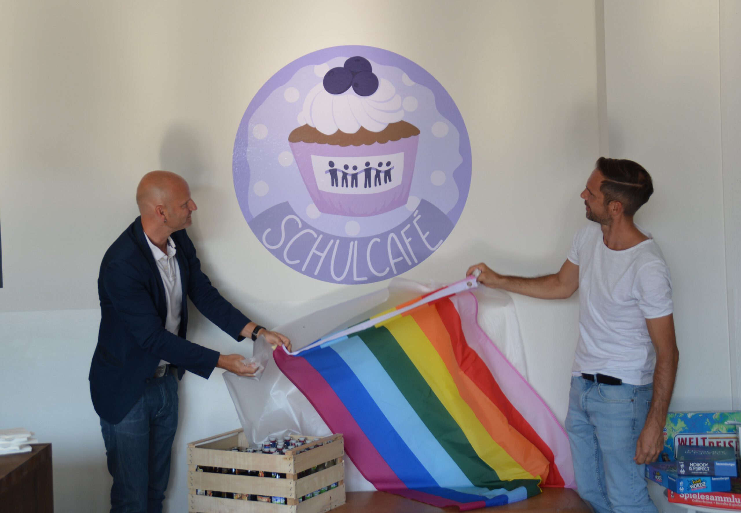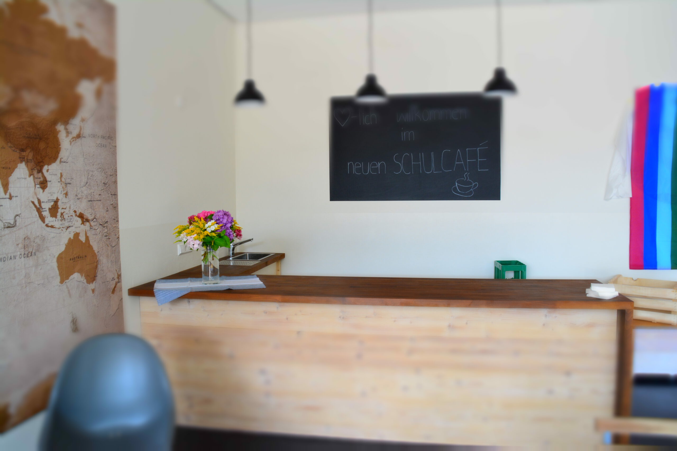 Am selben Abend wurde im Rahmen des Festakts zu Erasmus+ auch das neue, komplett renovierte Schulcafé eröffnet. Richtig gelesen – SCHULcafé. Hier treffen sich neben SchülerInnen auch LehrerInnen, Sekretärin, Hausmeister, Eltern, … alle am Schulleben Beteiligten sollen das Schulcafé als Ort der Begegnung und des Zusammenseins erleben und nutzen können. 2004 wurde das Vorgängercafé eröffnet, das allerdings eine lange Pause in den letzten Jahren hatte und nun wieder neues Leben eingehaucht bekommt. In den Mittagspausen wird das Schulcafé geöffnet sein, zum Erholen und Pause machen, spielen und reden und gemeinsam essen und trinken – und natürlich auch für unterschiedlichste Veranstaltungen außerhalb dieser Zeit.