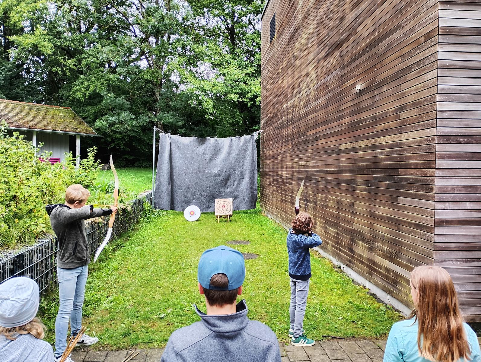Es gibt einen Schießplatz hinter der Schule zum Üben, die Fortgeschrittenen können das Gelernte im eigenen Bogenparcours nahe der Schule umsetzen. Der Parcours wurde gemeinsam errichtet, gepflegt und über den Winter auch wieder abgebaut. Denn das Waldgebiet, das uns zur Verfügung steht, ist vor allem das Wohnzimmer heimischer Rehe – und das wird respektiert.  In der wettermäßig schlechten Zeit ruhen die Pfeile. Im Sommer bei den Projekttagen werden sie stets genutzt.